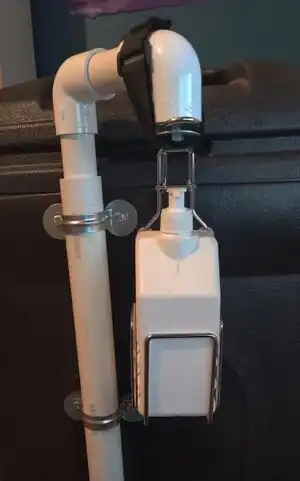 Trash Bot 2 is a simpler version of Trash Bot 1, made up of 3 main components: the wheeled 45 gallon trash can, the exterior mounted PVC pipe trigger mechanism and an exterior mounted Hand Sanitizer Holster.